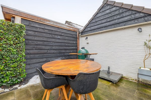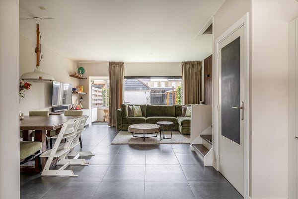 De open trap, afgewerkt met houten treden, versterkt het ruimtelijke karakter van de woonkamer. Daaronder is een praktische bergkast verwerkt voor extra voorraad of huishoudelijke spullen. Via een kleine hal aan de achterzijde bereikt u de achtertuin. Deze tussenruimte fungeert als een handig portaal dat de kou buiten houdt en de warmte binnen bewaart wanneer u de tuin inloopt. De tuin is een overzichtelijke en rustige plek die nauw aansluit bij de rest van het huis.
