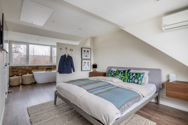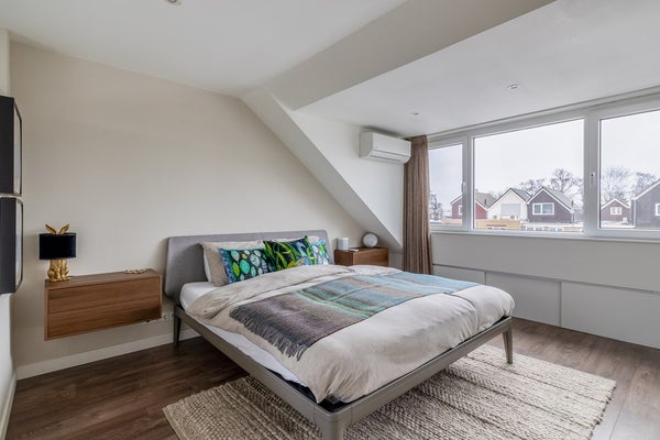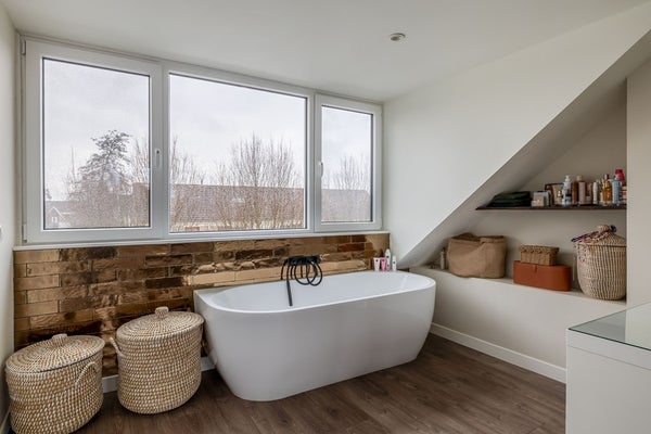 Op de tweede verdieping van de woning staat comfort centraal. Bij binnenkomst in de royale zolderkamer valt direct de prettige lichtinval op door de brede kunststof dakkapellen aan weerszijden, waarin elektrische rolluiken subtiel zijn weggewerkt. De ruimte is zorgvuldig ingericht voor een goede nachtrust, compleet met een airco-installatie en een stijlvolle kledingkast. De grootste verrassing bevindt zich echter in de kamer zelf: een eigen ligbad dat de ruimte een luxe, bijna hotelmatige uitstraling geeft. Het is de ideale plek om u even volledig terug te trekken en tot rust te komen.