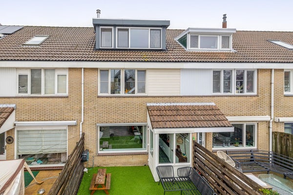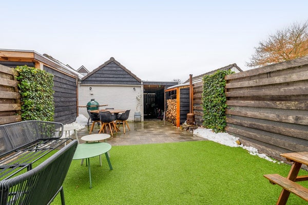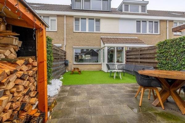 De achtertuin is gunstig gelegen op het zuiden, waardoor de zon de hele dag vrij spel heeft op het terras. De inrichting is praktisch en overzichtelijk gehouden met een combinatie van bestrating en een veldje van kindvriendelijk kunstgras. Naast de garage bevinden zich twee functionele overkappingen; de ene biedt een droge plek voor de fietsen of extra opslag, terwijl de andere specifiek is ingericht voor het stapelen van openhaardhout.