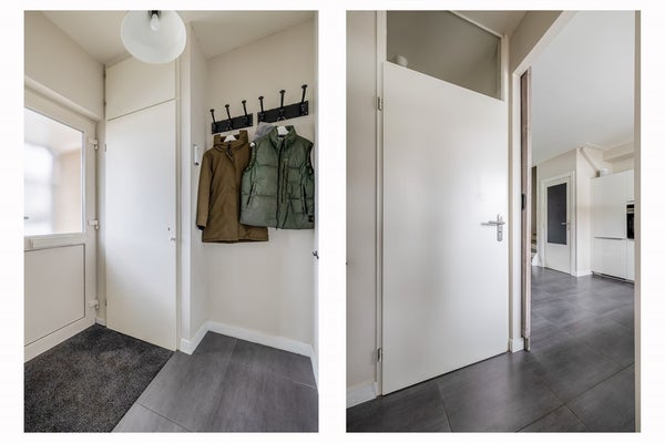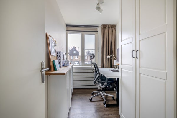 Aan de achterzijde van de woning bevinden zich nog twee slaapkamers die eveneens over prettige afmetingen beschikken. De badkamer vormt een verzorgd geheel; de wanden zijn volledig betegeld en de ruimte is praktisch ingericht met een douchecabine en een vrij hangend toilet. Een wastafelmeubel met twee waskommen en een handdoekradiator maken deze ruimte compleet.
