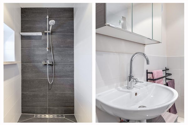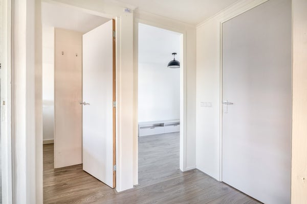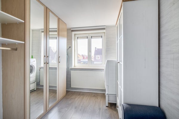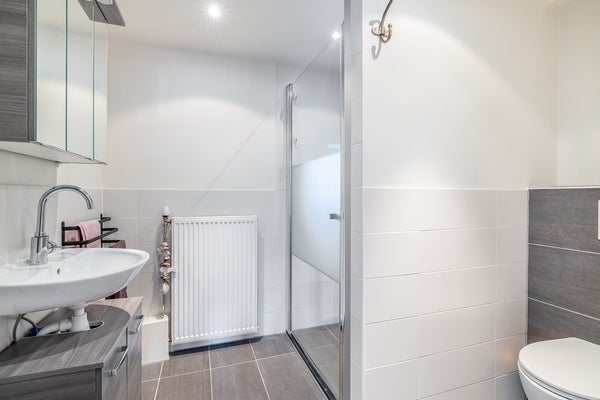 1e verdieping: Overloop met toegang tot drie slaapkamers, de badkamer en de vaste trap naar de zolderverdieping. De badkamer is afgewerkt met witte wandtegels en voorzien van een wastafel met meubel, vrijhangend toilet en een ruime inloopdouche. Aan de achterzijde bevinden zich twee slaapkamers, waarvan één is uitgerust met een vaste kastenwand. Aan de voorzijde ligt de derde slaapkamer.