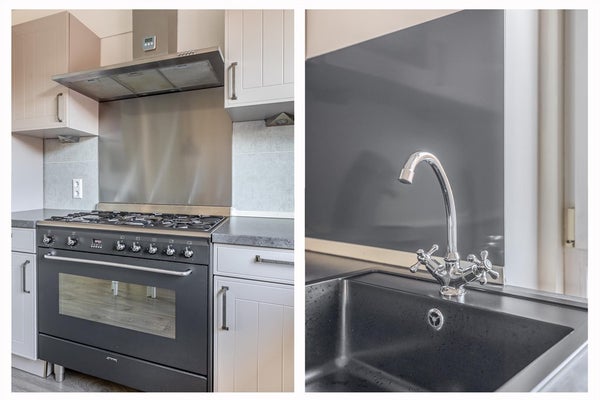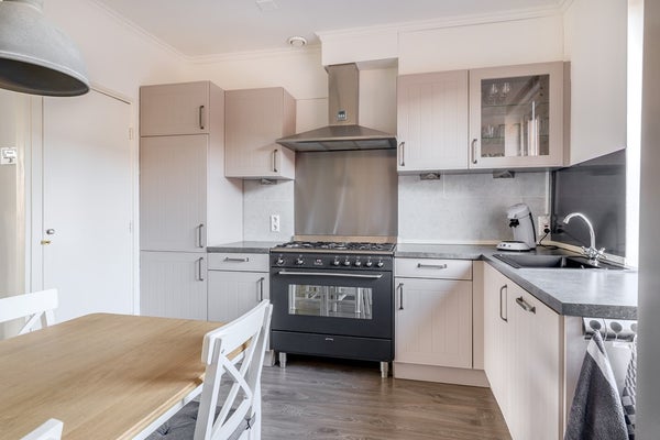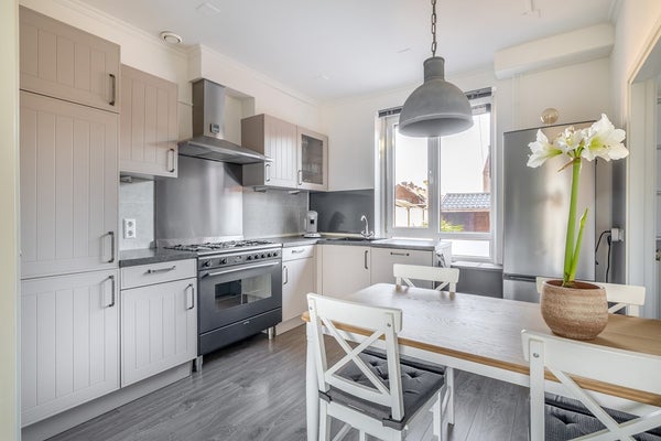 Begane grond: Entree van de woning, hal met garderobe, meterkast (8 groepen en 2 aardlekschakelaars) en trapopgang naar de eerste verdieping. De lichte woonkamer beschikt over een groot raam aan de voorzijde. Aan de achterzijde bevindt zich de luxe open keuken, uitgevoerd in een lichte kleurstelling en voorzien van diverse inbouwapparatuur. Zo is er een groot 5-pits fornuis met oven, een afzuigkap en een vaatwasser. De losstaande koel-vriescombinatie blijft bij de verkoop achter. Vanuit de keuken is de kelderruimte (met zijraam) onder de trap bereikbaar. Tevens biedt de keuken toegang tot de bijkeuken, waar zich de opstelplaats voor de wasmachine bevindt en de toiletruimte met vrijhangend toilet. Vanuit de bijkeuken is er toegang tot de zonnige, diepe achtertuin. De gehele begane grond is voorzien van een laminaatvloer.