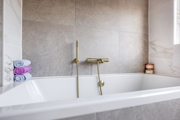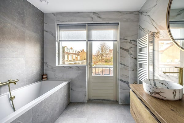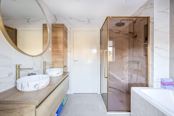De overloop geeft je toegang tot drie (voorheen 4) slaapkamers. De indeling is hier slim aangepast: de voormalige badkamer tussen de slaapkamers in wordt nu gebruikt als praktische wasruimte. De hoofdbadkamer is vorig jaar volledig vernieuwd en is een plek om heerlijk te ontspannen, compleet met een ligbad, een moderne inloopdouche, een tweede toilet en een fraai wastafelmeubel. Noemen we dit niet toevallig hotelchique? De drie slaapkamers zijn resepectievelijk 212 x 234 cm, 378 x 331 cm en 331 x 358 cm groot. En de twee laatstgenoemde kamers hebben beide een vaste kast. Op de overloop is een separaat toilet aanwezig.