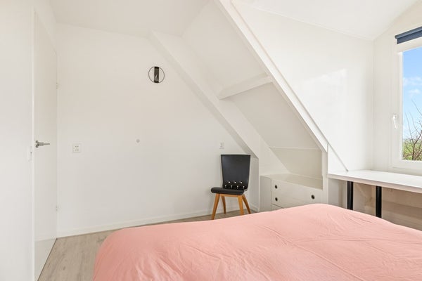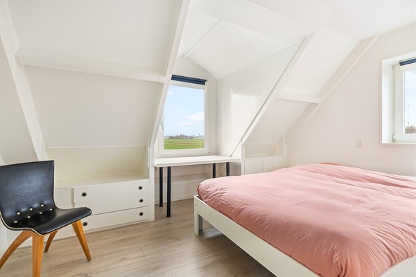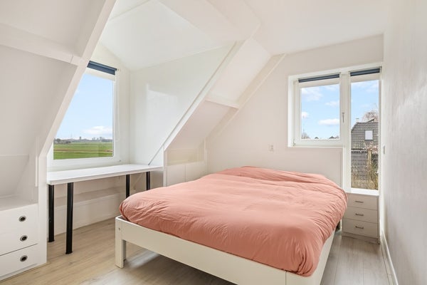 De derde slaapkamer is gelegen aan de zijkant van de woning en beschikt eveneens over een dakkapel en twee inbouwkasten. Vanuit deze kamer kijkt u uit over het water van de Broekervaart, een prachtig en rustgevend uitzicht.