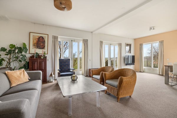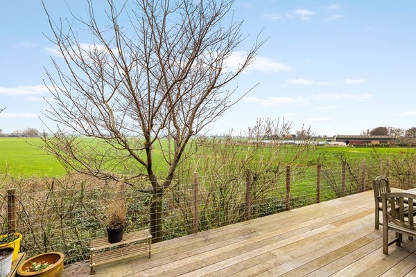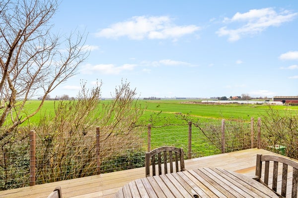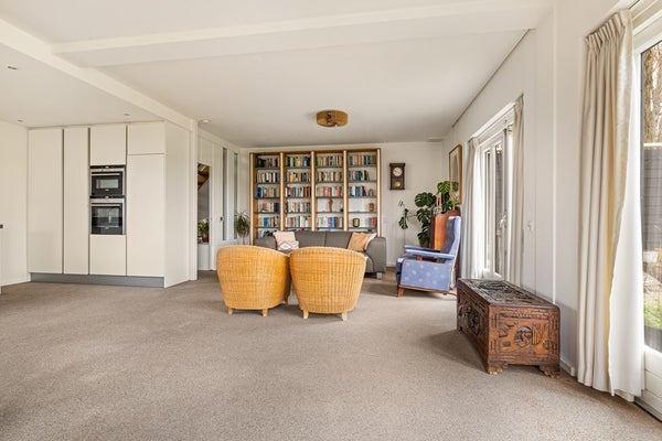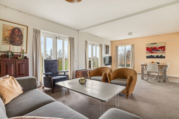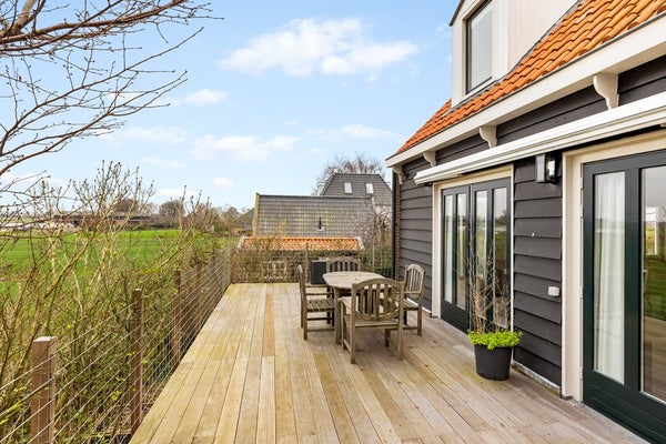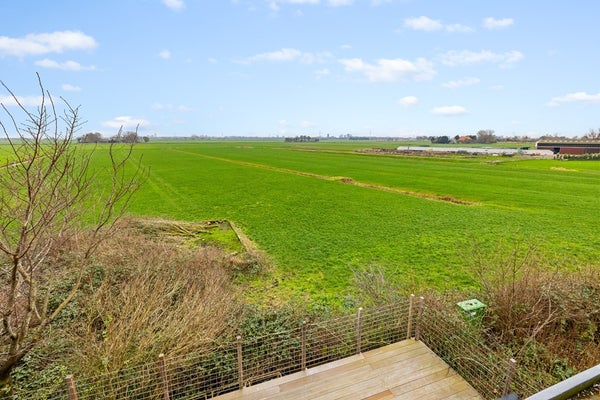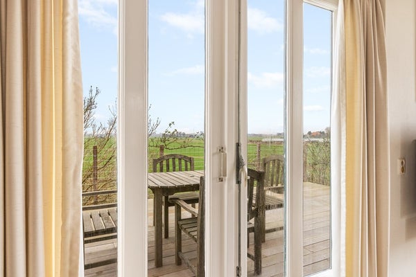Middels de openslaande deuren bereikt u het in 2025 aangelegde, royale terras/veranda van ca. 50 m², gelegen op het zuiden. Hier geniet u de hele dag van de zon en van een adembenemend vrij uitzicht over de weilanden, een unieke plek om volledig tot rust te komen.