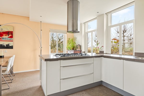 De moderne open keuken is van alle gemakken voorzien en beschikt over een 6-pits gasfornuis, vaatwasser, oven, magnetron en een koelkast. Een heerlijke plek om te koken en samen te komen, met volop licht en ruimte.