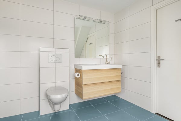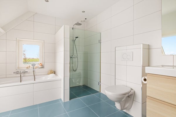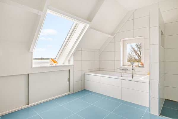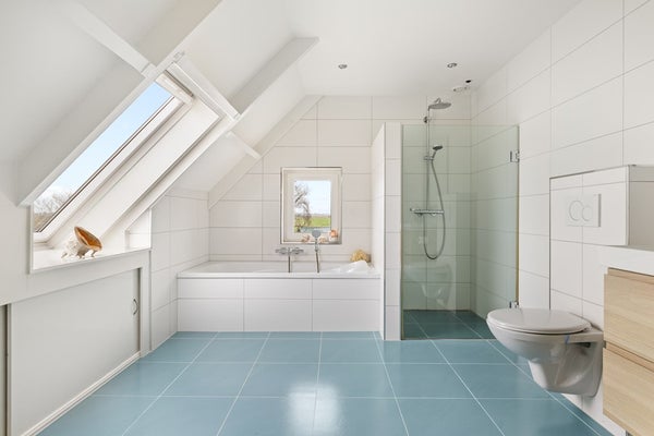 Op de overloop vindt u tevens een ruime bergkast. Aan de voorzijde van de woning ligt de royale badkamer, welke is voorzien van een ligbad, inloopdouche, toilet en een wastafelmeubel.
