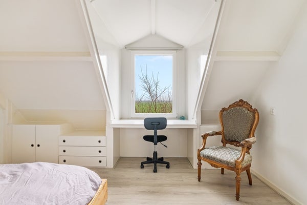 Via de vaste trap bereikt u de overloop. Aan de achterzijde bevinden zich twee ruime slaapkamers, beide voorzien van een dakkapel en twee inbouwkasten. Vanuit deze kamers heeft u een schitterend, vrij uitzicht over het weiland.