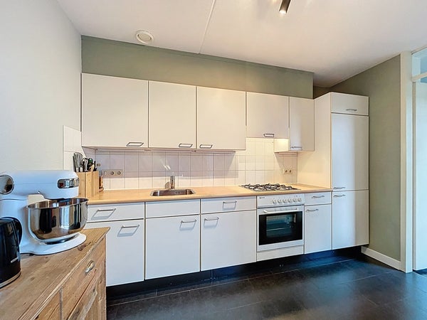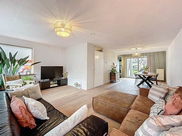 We betreden de woning middels de voordeur om in de hal de rondleiding te starten. Deze hal biedt plaats voor het toilet, de meterkast en de trap. Vervolgens betreden we de L-vormige woonkamer. Hier wordt pas echt duidelijk hoeveel ruimte er in de woning zit. Je hebt echt alle ruimte voor een lange eettafel en een royale gezellige zithoek. De lichte houten parketvloer zorgt voor extra sfeer en de grote raampartijen en de schuifpui zorgen voor veel lichtinval. De schuifpui biedt toegang tot het terras en vanaf de eettafel is daardoor ook de polder al te zien. Aansluitend staat de keuken in een open verbinding met de kamer. Deze keuken is voorzien van een koelkast, oven, 4 gaspitten en afzuiging. Vervolgens betreden we de bijkeuken met de witgoedvoorzieningen en de CV-ketel uit 2011. Tenslotte wordt langs hier ook de ruime garage betreden.