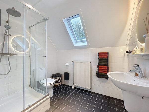 De overloop van de eerste verdieping biedt toegang tot de drie slaapkamers en de ruime badkamer. Opvallend hier is gelijk de ruimte van de overloop en de fraaie laminaatvloer die netjes tussen alle ruimtes door loopt. De master bedroom is ook echt weer royaal met genoeg ruimte voor een tweepersoonsbed, kledingkast en een bureau. De tweede slaapkamer is ook nog groot genoeg voor een tweepersoonsbed en kledingkast en de derde slaapkamer is een leuke kinderkamer met ruimte voor een éénpersoonsbed, kast en bureau. Tenslotte betreden we de chique badkamer met douchecabine, toilet en wastafel.