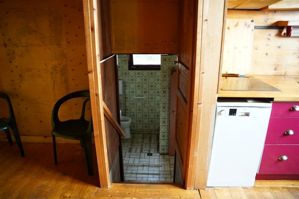 De keuken is eenvoudig uitgevoerd en biedt via een trapje toegang naar de lager gelegen badkamer met het 2e toilet, wastafel, douche en bijkeuken.