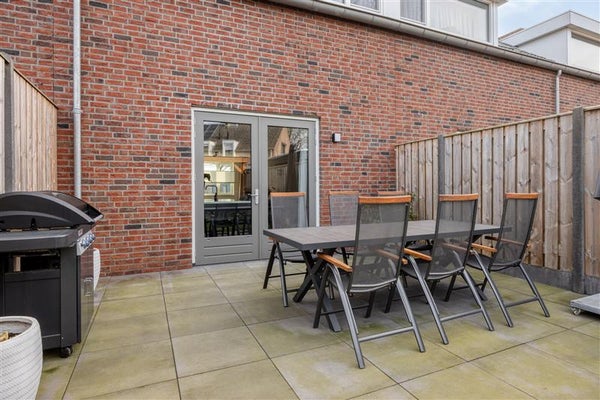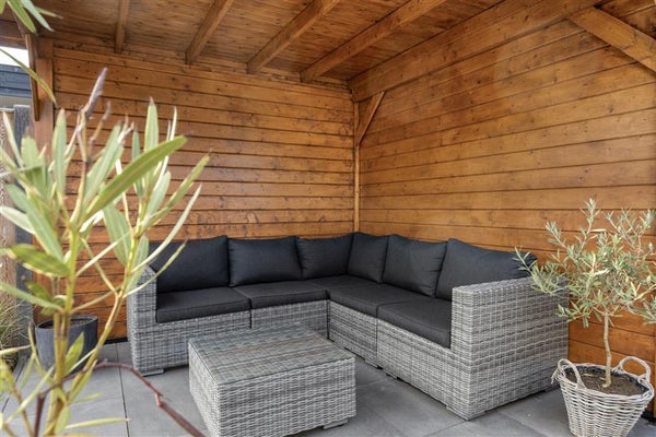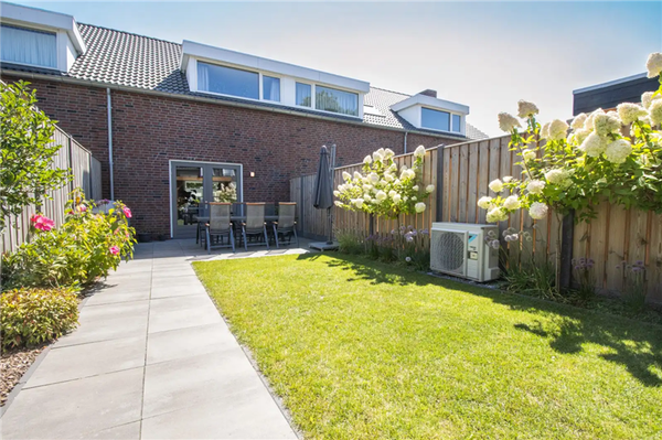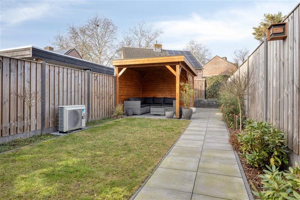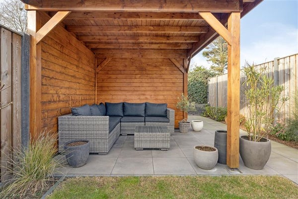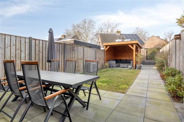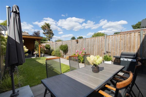 Buiten is het misschien nóg magischer. Via de openslaande deuren kom je in een zonnige achtertuin, compleet met een handige achterom én een berging. Deze berging is voorzien van een royale overkapping, wat betekent dat je hier zelfs met minder mooi weer heerlijk beschut kunt zitten. Denk aan lange zomeravonden met kaarslicht en goede gesprekken.