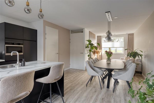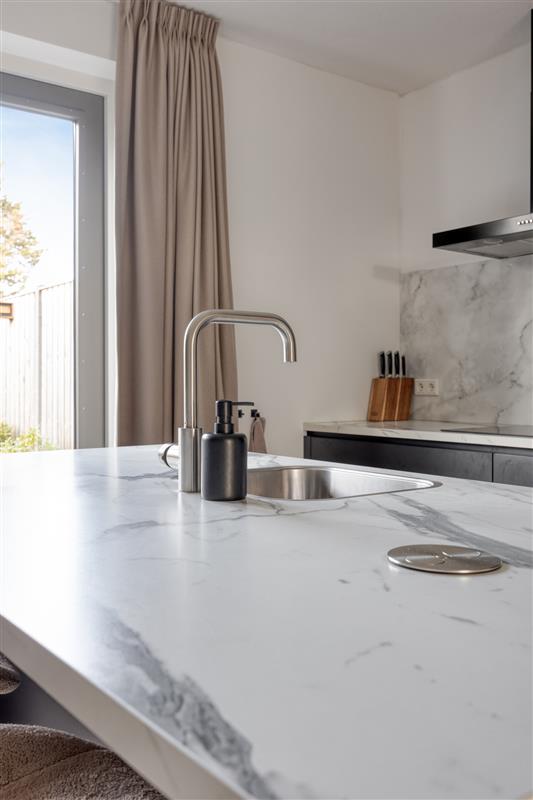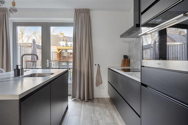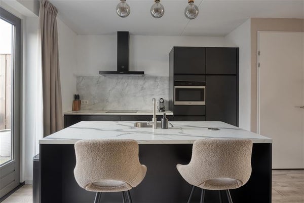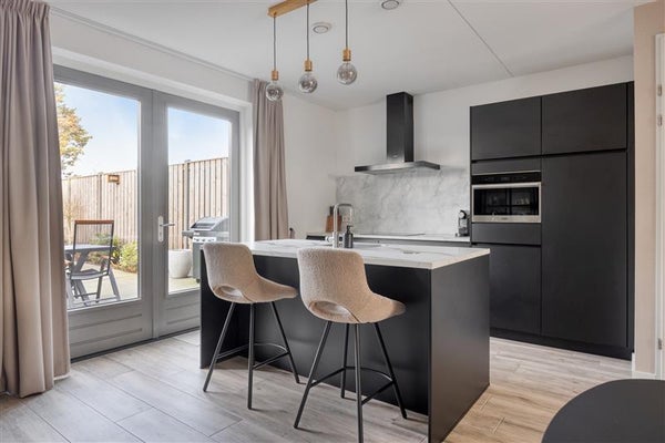 De moderne keuken is een absolute eyecatcher en dé plek waar functionaliteit en design samenkomen. Met een handige wandopstelling heb je genoeg opberg- en werkruimte, terwijl het centrale spoeleiland met barretje ideaal is voor kopjes koffie in de ochtend of gezellige borrels met vrienden. Koken is hier niet alleen een noodzaak, maar een echte beleving.