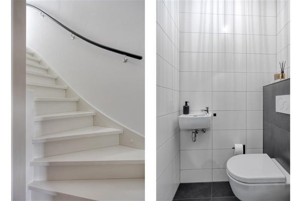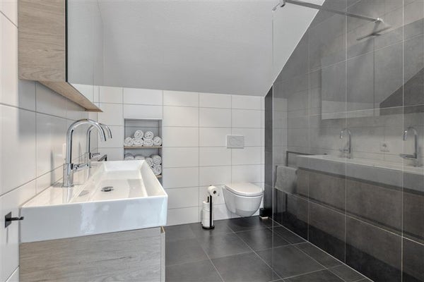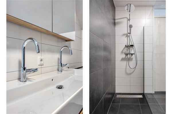 De moderne badkamer is alles wat je zoekt: een comfortabele inloopdouche met een glazen wand, dubbele wastafels voor drukke ochtenden en een strak toilet dat mooi in het geheel opgaat. Hier kom je fris de dag door – of die nu begint of eindigt met een warm badritueel.