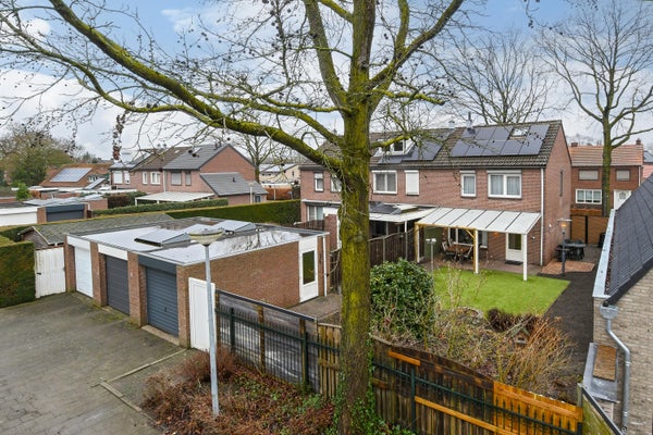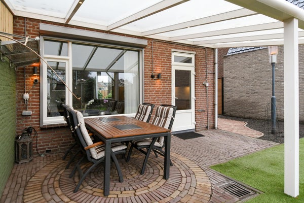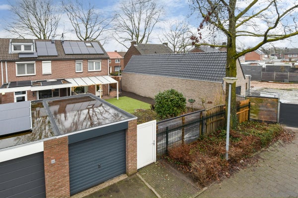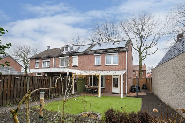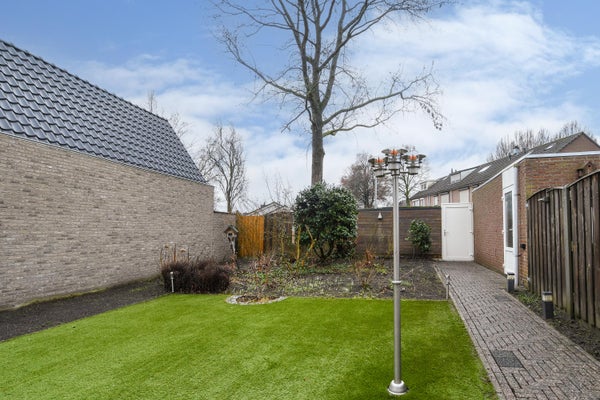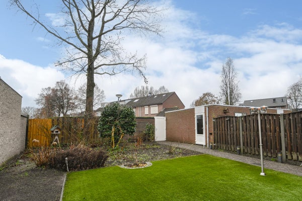Door de hoekligging beschikt de woning over een voortuin, zijtuin en een verrassend vrije achtertuin op het zuiden. De tuin is verzorgd aangelegd met een terras aan de woning, gazon en borders. Onder de terrasoverkapping geniet je beschut van het buitenleven.