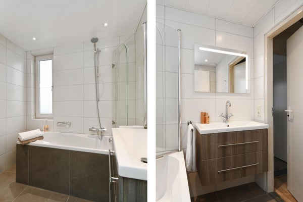De badkamer is praktisch ingedeeld en beschikt over een ligbad met douche, een wastafelmeubel én een stijlvolle designradiator.