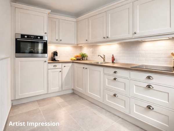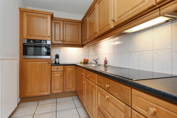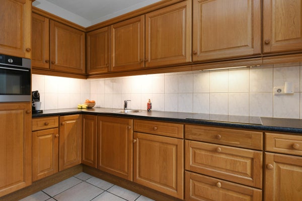De gesloten keuken is praktisch ingericht met een eikenhouten keuken en voorzien van diverse inbouwapparatuur. Vanuit de keuken heb je direct toegang tot de tuin. De begane grond is afgewerkt met een neutrale tegelvloer.