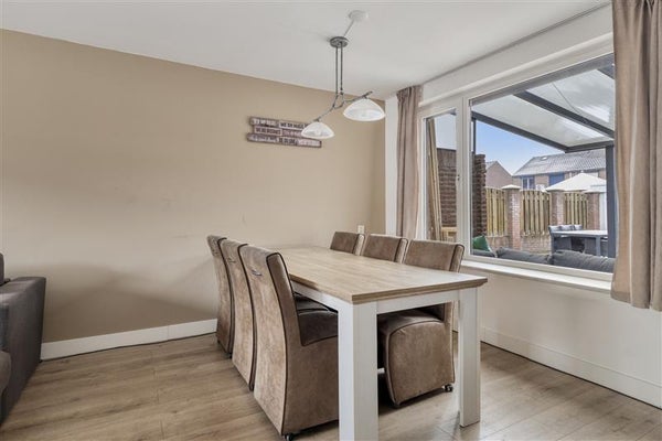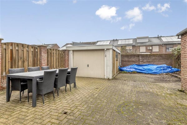 Via de keuken stap je zo je tuin in. Deze ligt op het oosten, wat betekent dat de eerste zonnestralen hier al vroeg in de ochtend neerstrijken. Ideaal om de dag te beginnen met een kop koffie en de krant. Bovendien is de tuin voorzien van een praktische overkapping, een perfecte plek om zowel bij zon als regen comfortabel buiten te kunnen zitten. Daarnaast vind je in de tuin de vrijstaande garage met elektriciteit, die ideaal is voor het stallen van je auto, fiets of als extra opslagruimte.