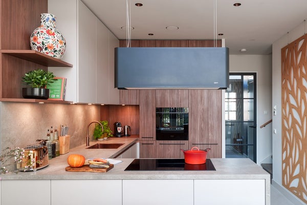 De luxe keuken met stijlvol schiereiland is van alle gemakken voorzien: inductiekookplaat, Novy Mood eilandschouw afzuigkap, Quooker, Siemens combi-stoomoven, vaatwasser, koelkast en een vriezer.