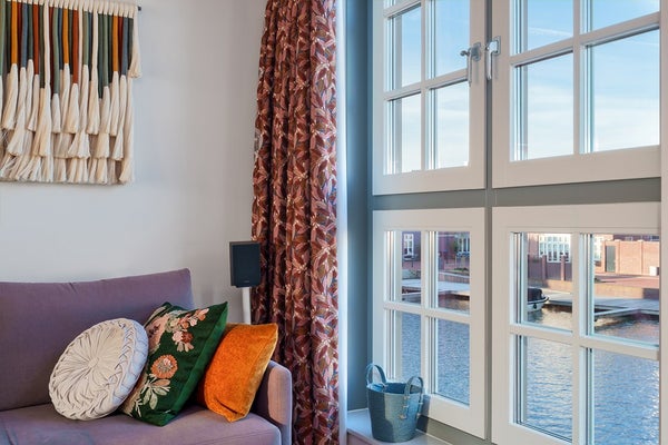 The first floor is arranged as the living room and offers an atmospheric, light-filled space with a mezzanine and stunning views over the marina. The characteristic windows with muntins, open views and the lively scene of passing boats create a truly unique living experience.