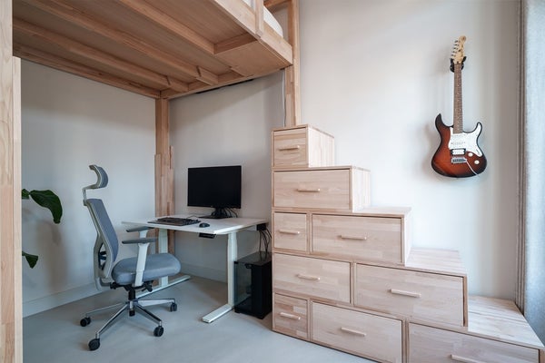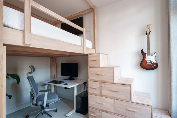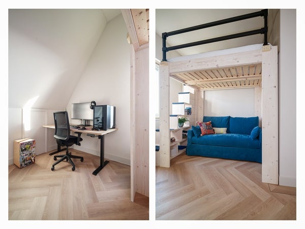 Through the entrance you reach the hallway with toilet, a multifunctional room and the open-plan kitchen. This room is ideal as a home office or guest room and features an electrically height-adjustable loft bed and French doors.