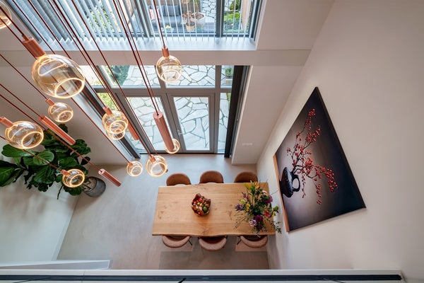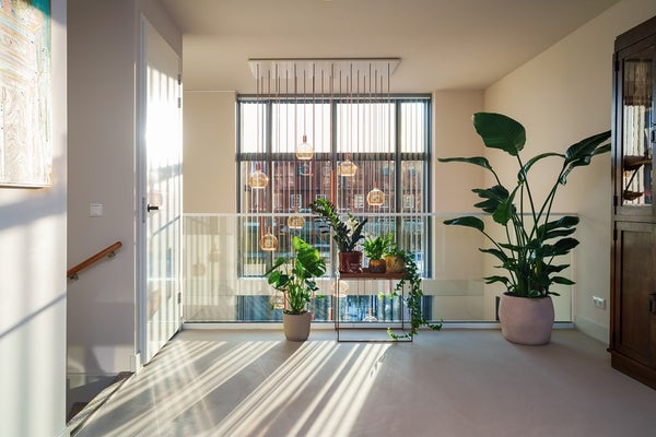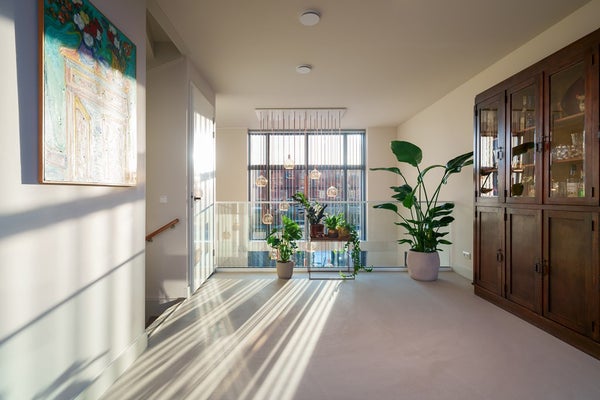 Bij binnenkomst valt direct het hoge afwerkingsniveau op: een strakke gietvloer met vloerverwarming, een zee aan licht en een indrukwekkende woonkeuken met een vrije hoogte van maar liefst 6 meter. Dankzij de vele ramen met elektrisch bedienbare lamellen is dit zonder twijfel het zonnigste en meest bijzondere deel van de woning.