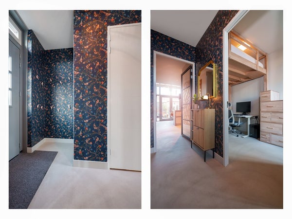 Via de entree bereik je de hal met toilet, een multifunctionele kamer en de woonkeuken. Deze kamer is ideaal als thuiskantoor of logeerkamer en beschikt over een elektrisch in hoogte verstelbaar loft bed en openslaande deuren.