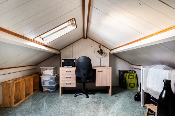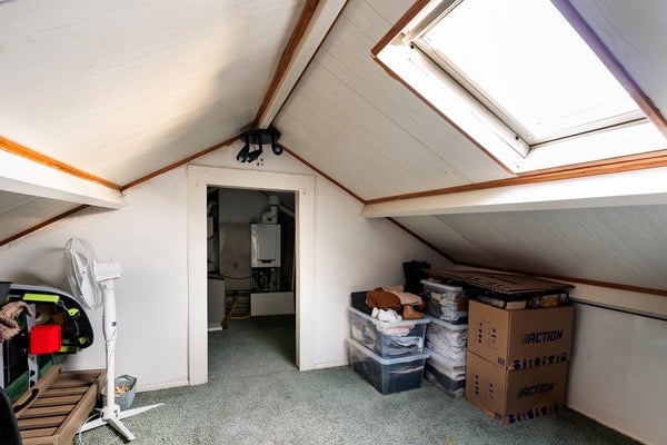 Via een vaste trap kom je op de zolder, waar de c.v.-installatie (Remeha Tzerra, 2016) is geplaatst. Vanaf de zolderoverloop bereik je de zolderkamer, die is voorzien van een Velux dakraam en knieschotten. Hierdoor is er aan beide zijden van de kamer volop praktische bergruimte aanwezig.