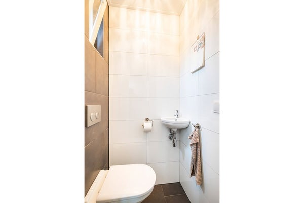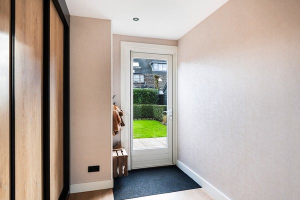 Via de entree kom je in de hal, die toegang geeft tot de meterkast, toiletruimte met wandcloset en fontein, trapopgang naar de 1e verdieping, provisiekast en de woonkamer. De sfeervolle woonkamer is aan de voorzijde gesitueerd en is net als de rest van de begane grond strak afgewerkt met gladde wanden en een glad plafond. Dankzij de uitbouw aan de achterzijde is er ruimte voor een royal eethoek en ook zijn hier in het plafond inbouwspots aanwezig. De keuken met rechte opstelling en neutrale kleurstelling is voorzien van divers inbouwapparatuur, waaronder een inductiekookplaat, afzuigkap, koelkast, combi oven en vaatwasser. Dankzij de uitbouw is er ook een praktische bijkeuken gerealiseerd, met toegang tot de tuin en een nette kastenwand met aansluitingen voor de wasmachine en droger. Tot slot is op de begane grond (m.u.v. hal) vloerverwarming aanwezig.