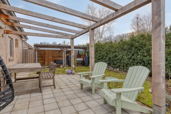 - Privacy biedende tuin met tuinhuis en sfeervolle overkapping