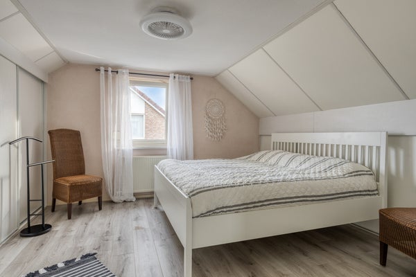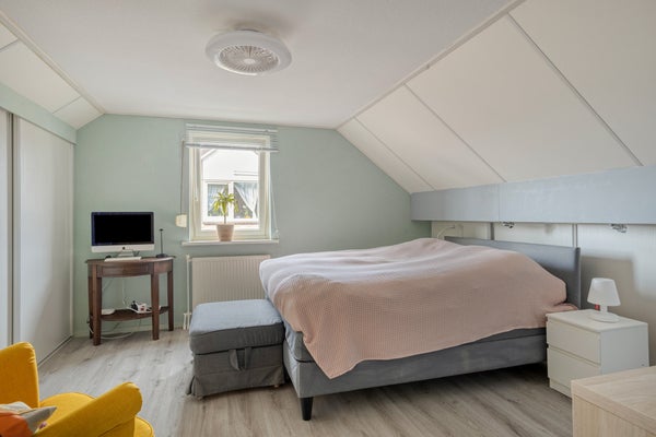 De 2 lichte slaapkamers zijn ruim, hebben een zijgevelraam en praktische schuifkasten in de knieschotten. Deze inbouwkasten bieden voldoende opbergruimte.