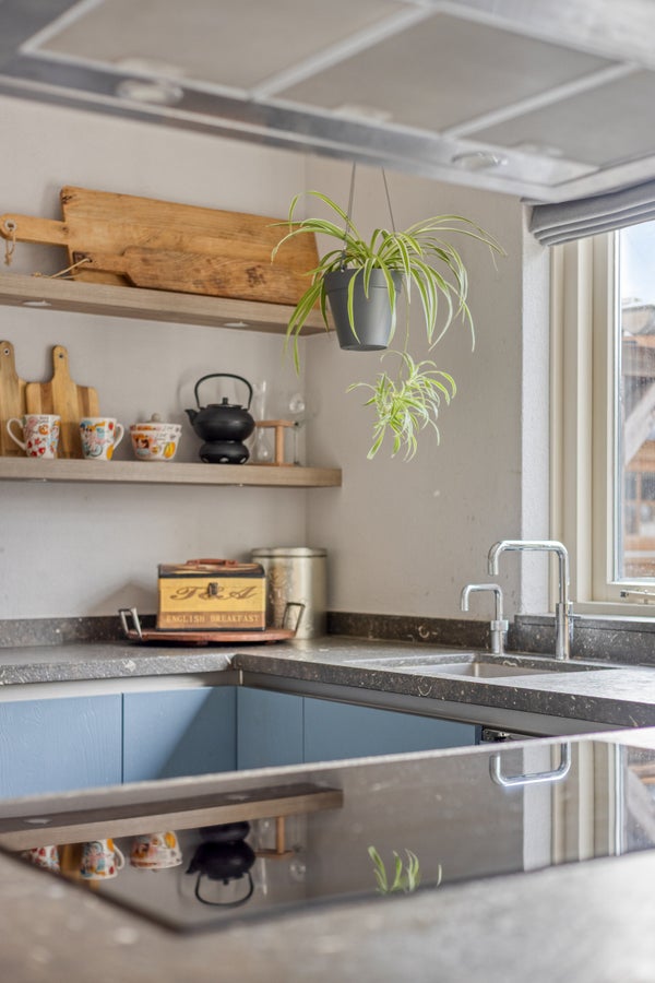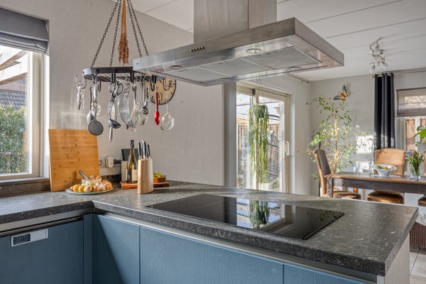 De nette halfopen U-vormige inbouwkeuken met een schitterend geborsteld natuurstenen aanrechtblad, heeft boven- & onderkasten, lades en een handige eetbar voor 2 personen. Deze complete inbouwkeuken is uitgerust met een Quooker, een rvs vrijhangende design afzuigkap, een 5-pits inductiekookplaat, een koelkast, vriezer, een combi oven en een vaatwasser (2024).