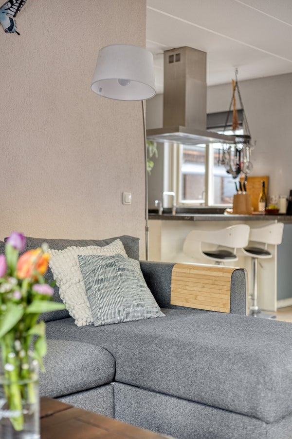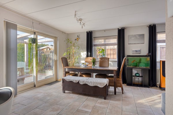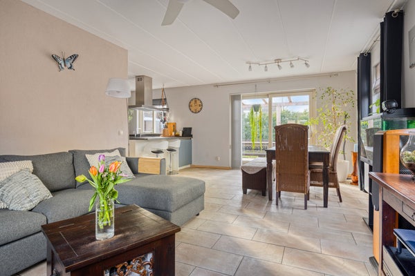 De lichte/aantrekkelijke L-vormige woonkamer heeft meerdere raampartijen en een schuifpui. Door de goed geplaatste raampartijen komt er veel natuurlijk daglicht binnen. Dit geldt overigens voor de hele woning.