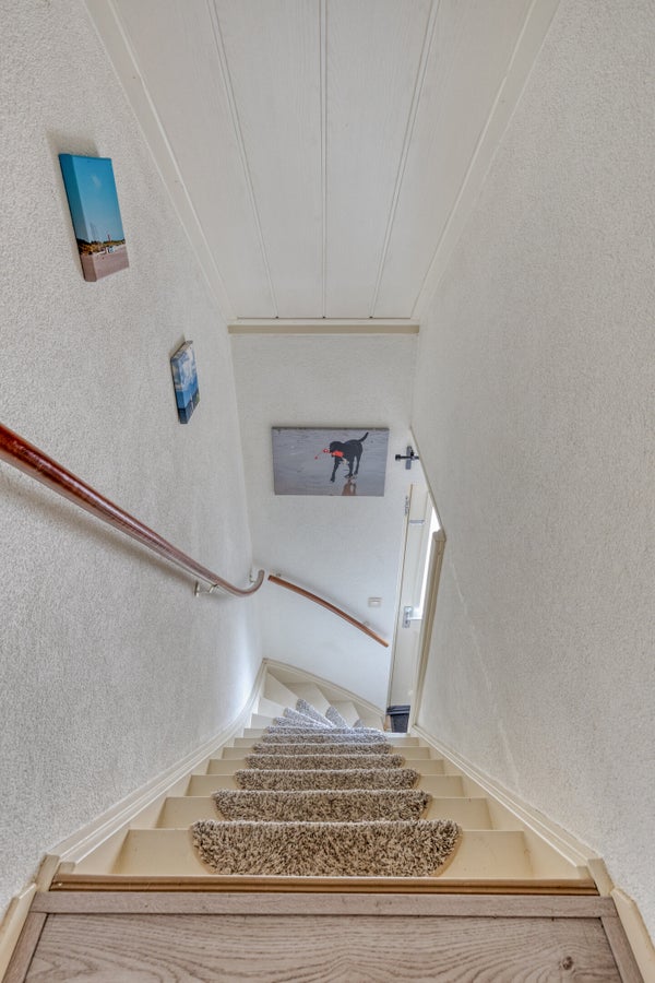 Via de vaste trap in de ontvangsthal, komt u uit op de overloop (betonvloer) van de 1e verdieping met 2 slaapkamers, de badkamer en een CV ruimte - Intergas (2024).