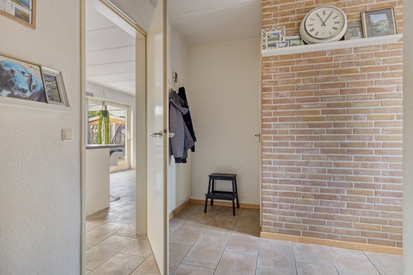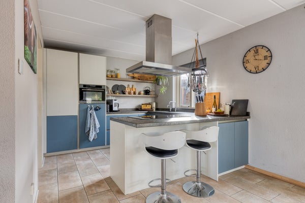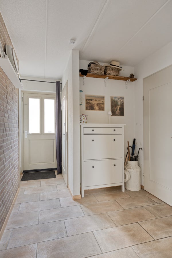 De praktische bijkeuken, met zijentree, is grotendeels betegeld en gedeeltelijk gestuct. In deze bijkeuken treft u een ingebouwde kast en een aansluiting voor de wasmachine & droger aan.