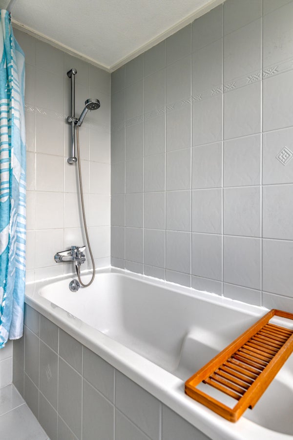 De nette/lichte badkamer is geheel betegeld, heeft een grote dakkapel en is voorzien een wastafelmeubel, ligbad en een vrijhangend toilet.