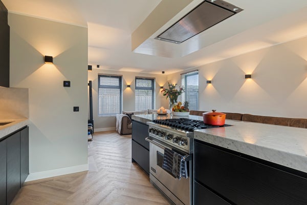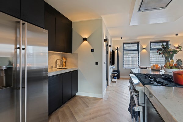 De luxe open keuken vormt het stijlvolle hart van de woning en is uitgevoerd met een royaal kookeiland voorzien van een elegant marmeren aanrechtblad. Het kookeiland biedt volop bergruimte dankzij diverse kasten en lades en is uitgerust met een 6-pits Viking Professional gasfornuis met oven en een afzuigunit. Daarnaast is de keuken alvast voorbereid op inductie koken door de reeds aanwezige loze leiding. Aan het kookeiland is ruimte gecreëerd voor een gezellige baropstelling, een heerlijke plek om samen te komen tijdens het koken en eten.