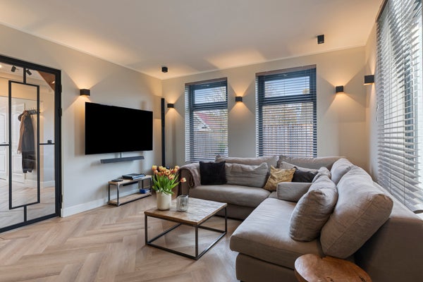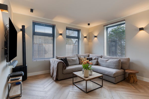 De woonkamer is een moderne maar sfeervolle en perfecte combinatie van licht, ruimte en uitzicht. Dankzij de royale raampartijen en de glazen pui geniet u hier van een schitterend, vrij uitzicht over de tuin en de omliggende landerijen. De ruimte is strak en modern afgewerkt met glad gestucte wanden en plafonds, voorzien van dimbare wand- en inbouwspots die de sfeer compleet maken.