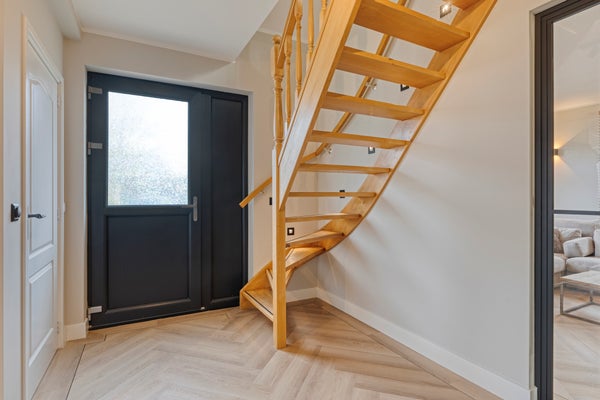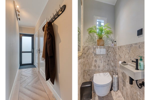 Bij binnenkomst in de stijlvolle ontvangsthal wordt direct duidelijk dat deze woning met oog voor detail en eigentijdse sfeer is afgewerkt. De ruime hal biedt door middel van een fraaie stalen deur toegang tot de woonkamer. Vanuit de hal is ook de entree naar de slaapkamer met badkamer ensuite, de meterkast, de wasruimte, de toiletruimte en trapopgang naar de eerste verdieping. De gehele begane grond is voorzien van een prachtige pvc-vloer in visgraatmotief met bies, wat zorgt voor een chique en warme uitstraling.