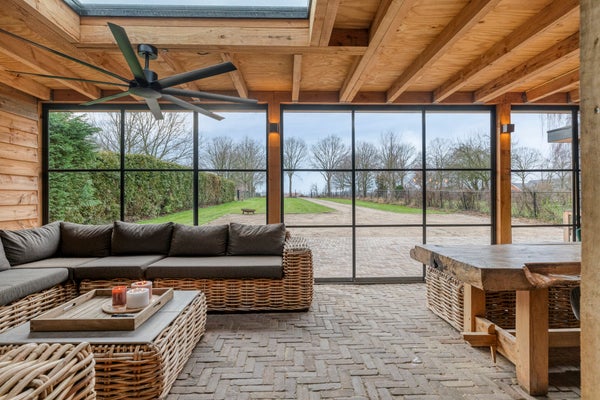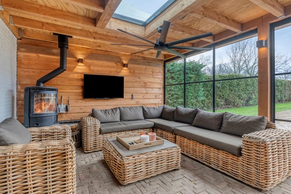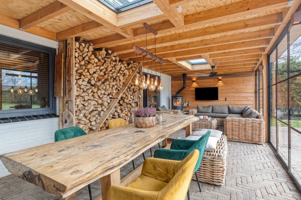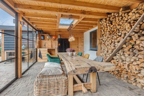 Voor de koelere dagen is de tuinkamer voorzien van een stoere houtkachel. Daarnaast beschikt deze ruimte over een praktisch aanrechtblok met zowel warm als koud water. De vloer is uitgevoerd in dezelfde bestrating als het aangrenzende terras, wat zorgt voor een naadloze overgang tussen binnen en buiten.