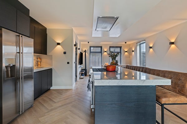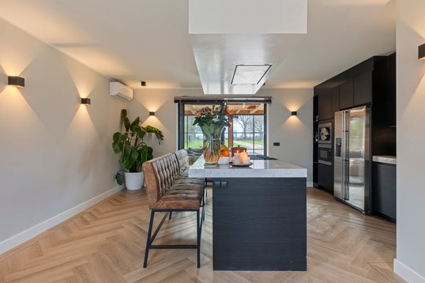 Langs de wand bevindt zich een compleet en hoogwaardig keukenblok met een spoelbak en Quooker-kraan, een vaatwasser, een Amerikaanse koelkast met ijsblokjesfunctie, een Miele powersteamer en een magnetron. Deze keuken combineert luxe, functionaliteit en comfort en is daarmee perfect voor de echte thuiskok .