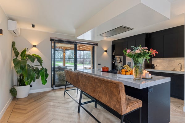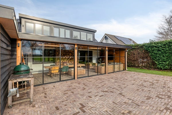 Vanuit de woonkamer met open keuken is de aangebouwde tuinkamer bereikbaar, een heerlijke plek om in elk seizoen te verblijven en optimaal te genieten van het binnen- en buitenleven. Twee lichtkoepels zorgen voor een prachtige lichtval van natuurlijk daglicht, terwijl de steellook glazen pui volledig kan worden geopend voor een directe verbinding met de tuin.