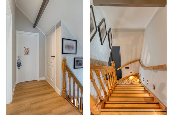 De trap in de ontvangsthal leidt naar de eerste verdieping, waar de overloop toegang biedt tot twee slaapkamers en een luxe badkamer. Een van de twee slaapkamers is zeer ruim bemeten. Op de overloop bevindt zich tevens een praktische technische ruimte met de c.v.-installatie.