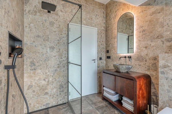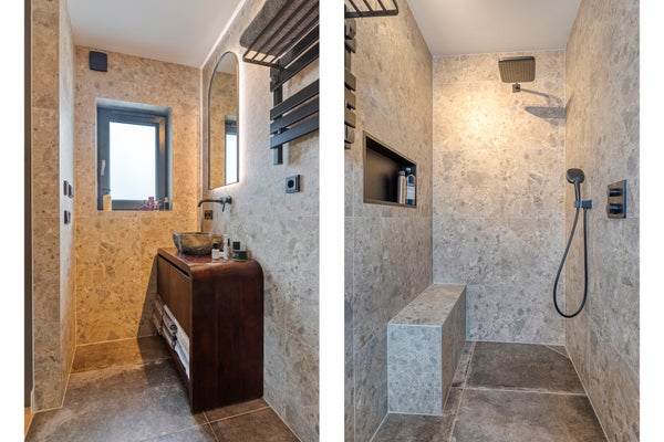 De ensuite badkamer is luxe uitgevoerd en beschikt over een ruime inloopdouche met zowel een regen- als handdouche. Verder is de badkamer voorzien van een natuurstenen wastafel op een fraai badkamermeubel, een verwarmde spiegel en een ingebouwde DAB-radio. Elektrische vloerverwarming zorgt hier voor extra comfort.