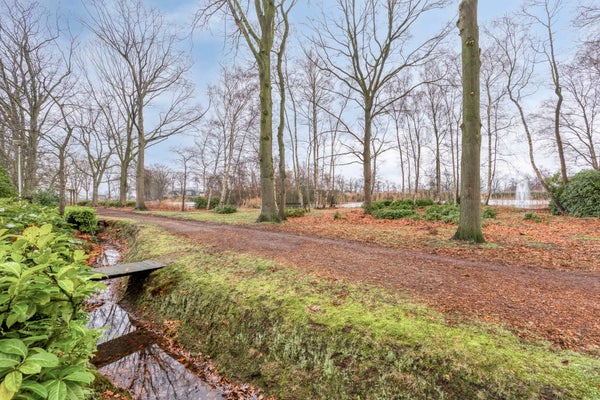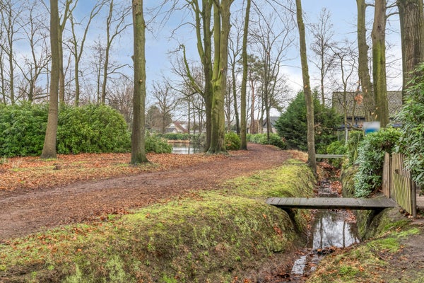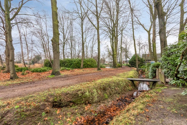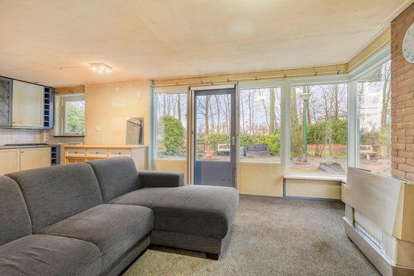 De sfeervolle, tuingerichte woonkamer met een eenvoudig keukenblok, een moederhaard & radiatoren, heeft forse raampartijen, ligt fraai aan de achterzijde, kijkt uit op uw eigen, brede achtertuin, met aangrenzend een parkachtige zone en uitzicht op de vennen.