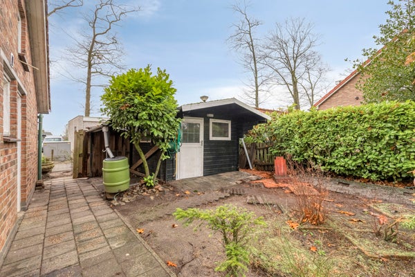 De tuin is voorzien van bestrating, vaste beplanting en een tuinhuis.