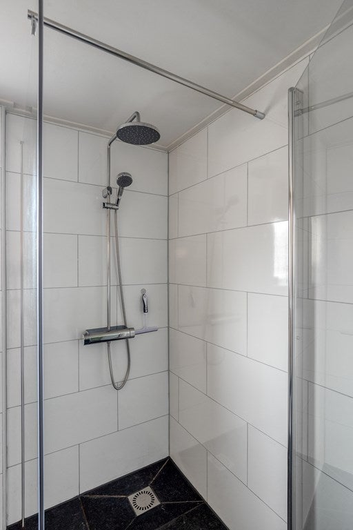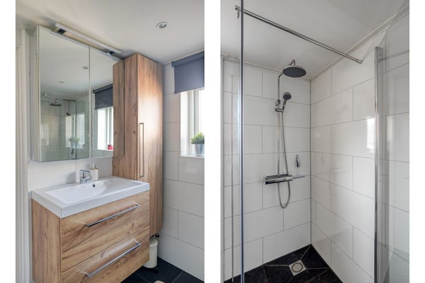 Vanuit een tussenhal achter de keuken zijn het toilet, de badkamer (2025) en deur naar de achtertuin bereikbaar.
