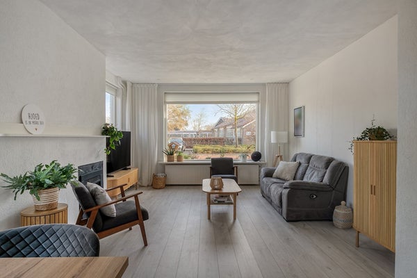 Via een overdekte entree aan de voorzijde kom je in de hal met een ruime kelderkast en trap naar de verdieping en toegang tot de keuken. Via de keuken kom je in de lichte woonkamer welke is voorzien van drie raampartijen en een schouw met elektrische haard.
