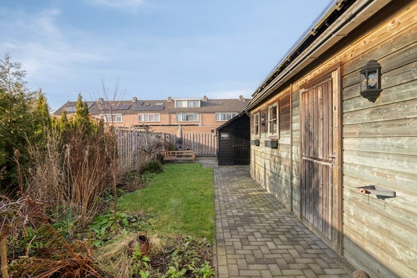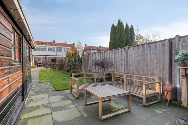 De zeer ruime diepe achtertuin ligt op het westen en is opgedeeld in twee compartimenten voor optimale privacy. Door deze ligging en dn de diepte van de achtertuin is er snel een plekje in de zon te vinden.
