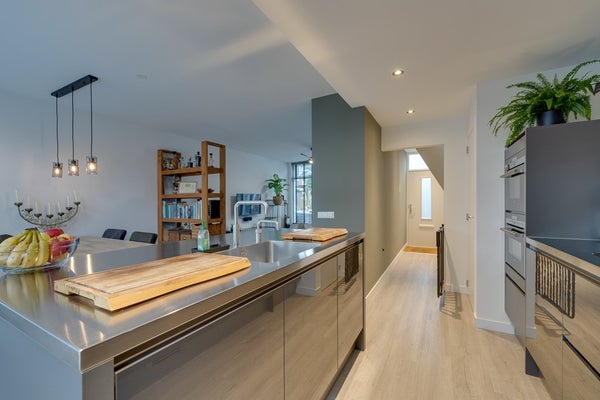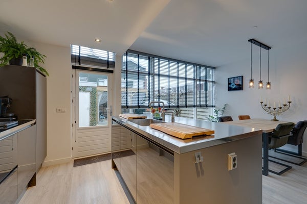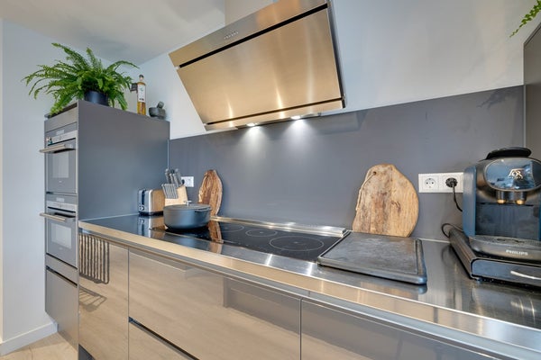 De luxe keuken is modern uitgevoerd en voorzien van hoogwaardige inbouwapparatuur van Siemens en Gaggenau. De keuken beschikt over een vaatwasser, inductiekookplaat met afzuigkap, stoom-en combioven, een wijnklimaatkoelkast en Quooker heet waterkraan. Er is voldoende kastruimte en de keuken is afgewerkt met een strak, roestvrijstaal werkblad.
